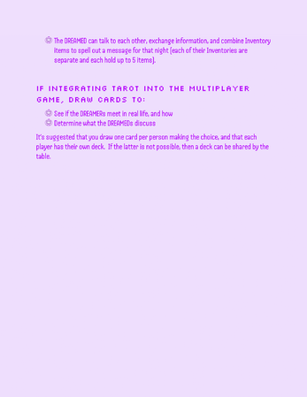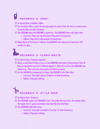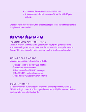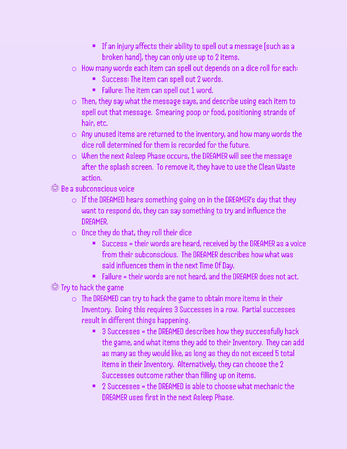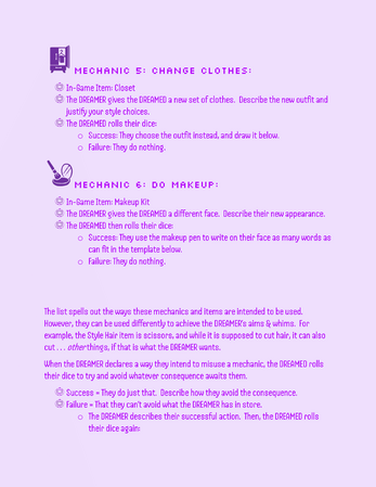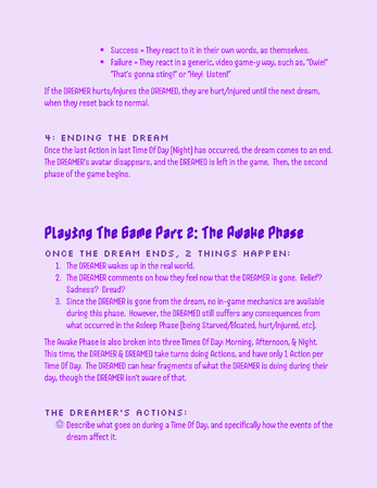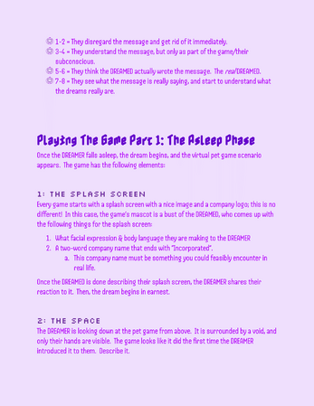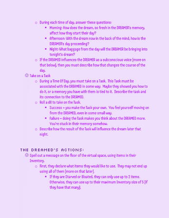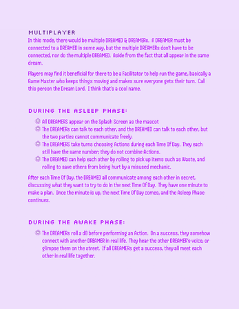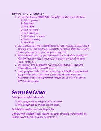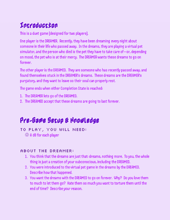 A roleplaying game about a DREAMER having dreams about a dead person as a virtual pet, and the DREAMED who is a soul stuck as a virtual pet as their purgatory. One wants the dreams to go on forever, the other wants the dreams to end. Which will win out in the end?